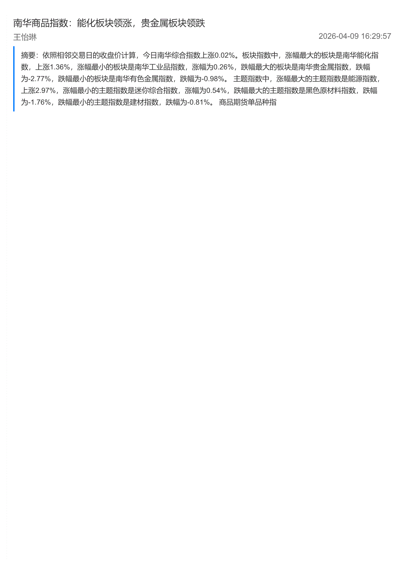 南华期货-商品指数:能化板块领涨,贵金属板块领跌-260409