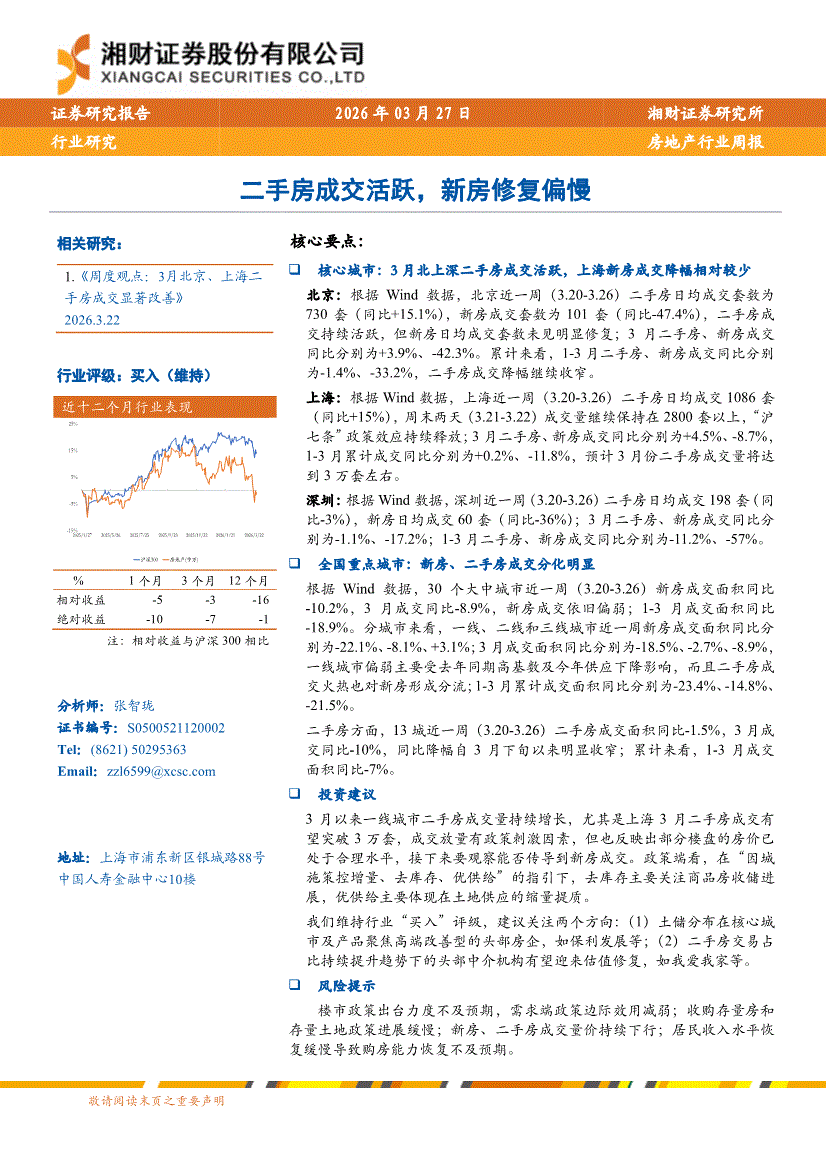 房地产行业:湘财证券-房地产行业周报:二手房成交活跃,新房修复偏慢-260327
