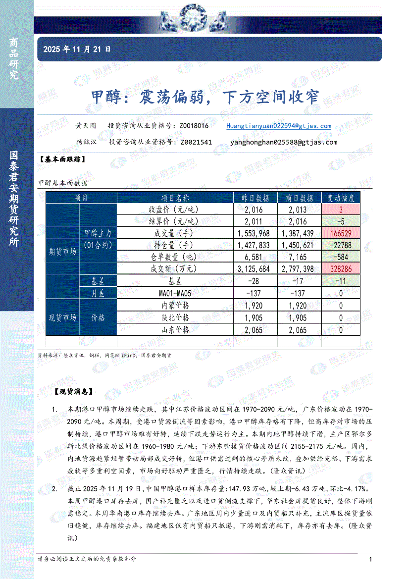 国泰君安期货-甲醇:震荡偏弱,下方空间收窄-251121