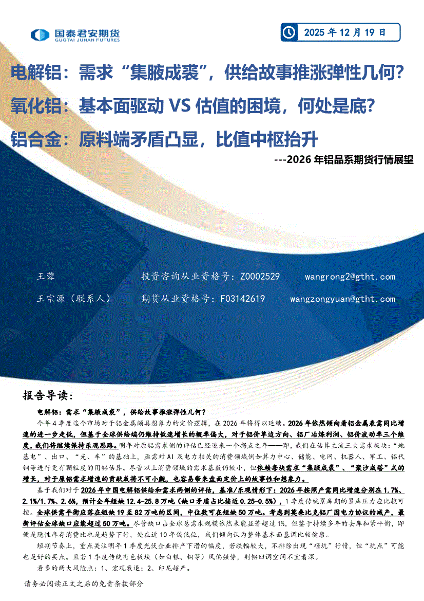 国泰君安期货-2026年铝品系期货行情展望:电解铝,需求“集腋成裘”,供给故事推涨弹性几何?氧化铝,基本面驱动VS估值的困境,何处是底?铝合金,原料端矛盾凸显,比值中枢抬升-251219