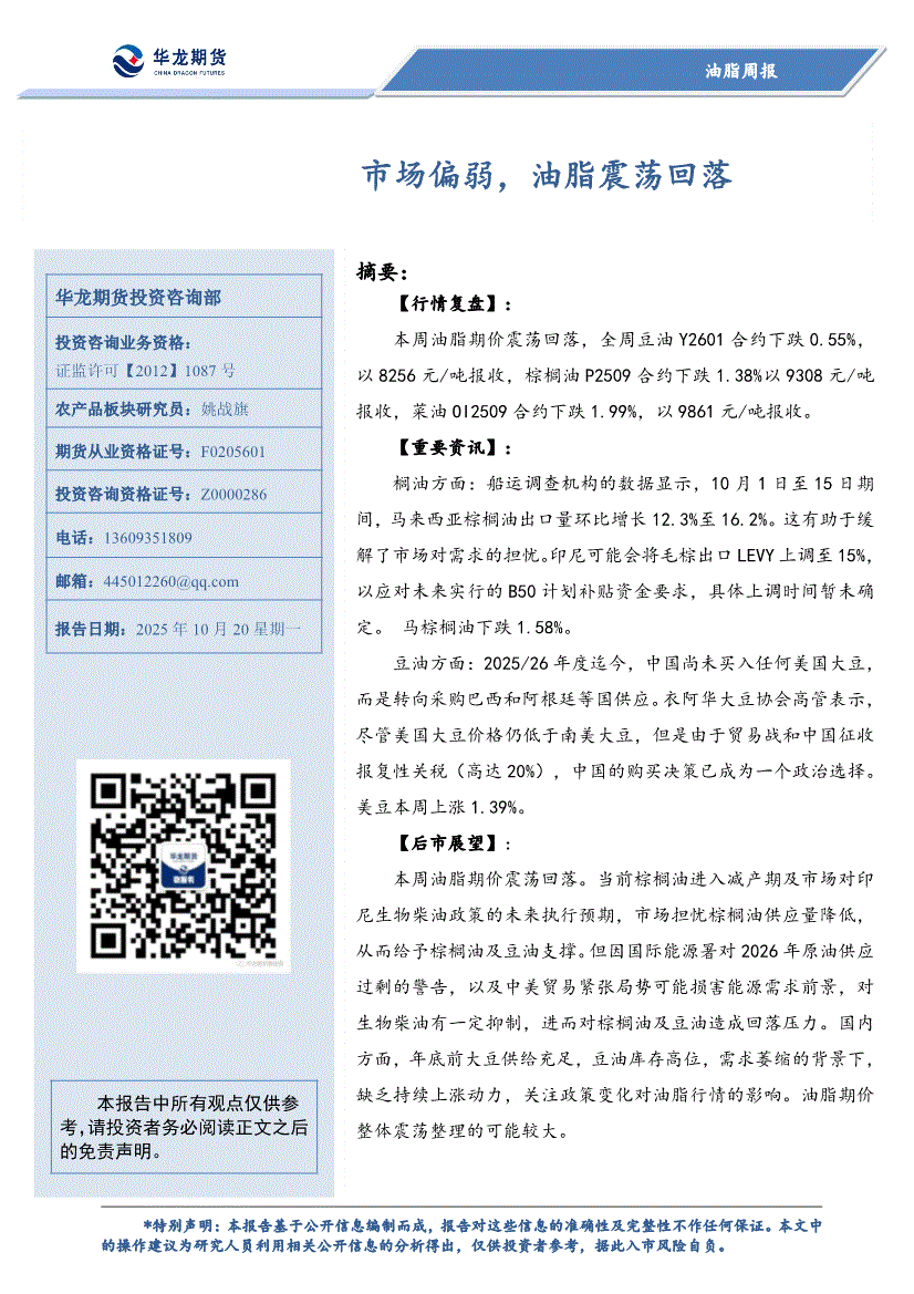 华龙期货-油脂周报:市场偏弱,油脂震荡回落-251020