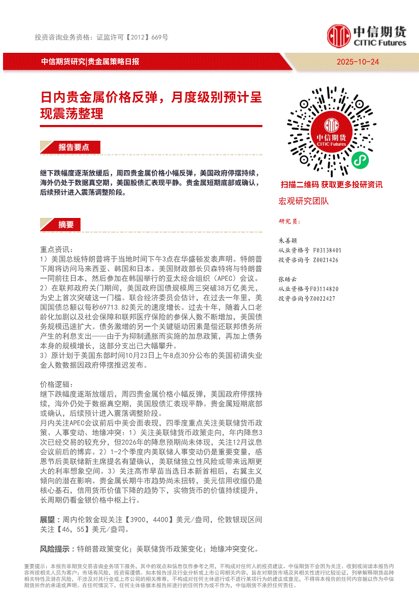 中信期货-贵金属策略日报:日内贵金属价格反弹,月度级别预计呈现震荡整理-251024