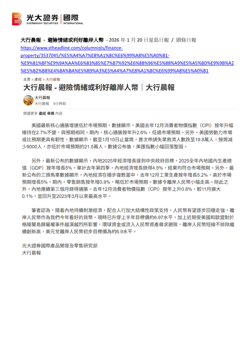 光大证券(国际)-大行晨报:避险情绪或利好离岸人币-260120