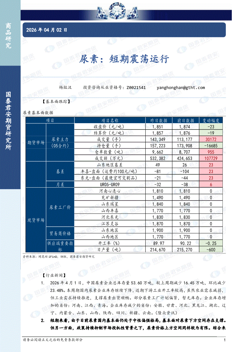 国泰君安期货-尿素:上有压力,下有支撑,区间运行-260326