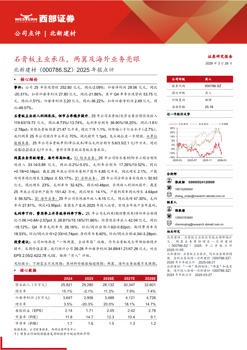 北新建材:西部证券-北新建材-000786-2025年报点评:石膏板主业承压,两翼及海外业务亮眼-260326
