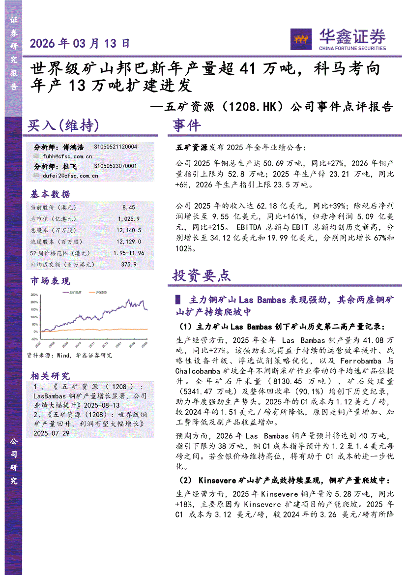 五矿资源:华鑫证券-五矿资源-1208.HK-公司事件点评报告:世界级矿山邦巴斯年产量超41万吨,科马考向年产13万吨扩建进发-260313