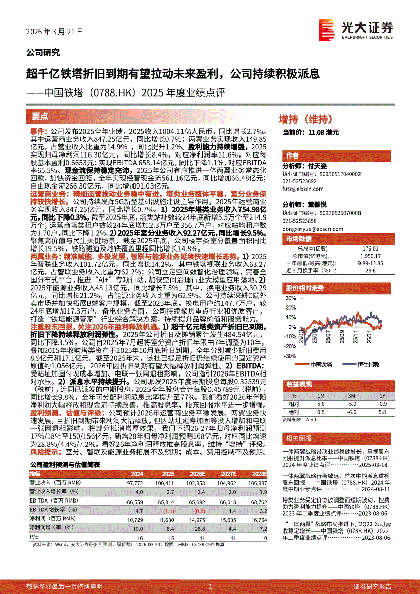 中国铁塔:光大证券-中国铁塔-0788.HK-2025年度业绩点评:超千亿铁塔折旧到期有望拉动未来盈利,公司持续积极派息-260321