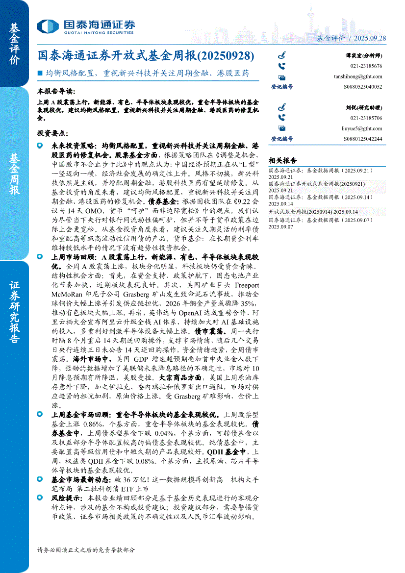 国泰海通证券-开放式基金周报:均衡风格配置,重视新兴科技并关注周期金融、港股医药-250928