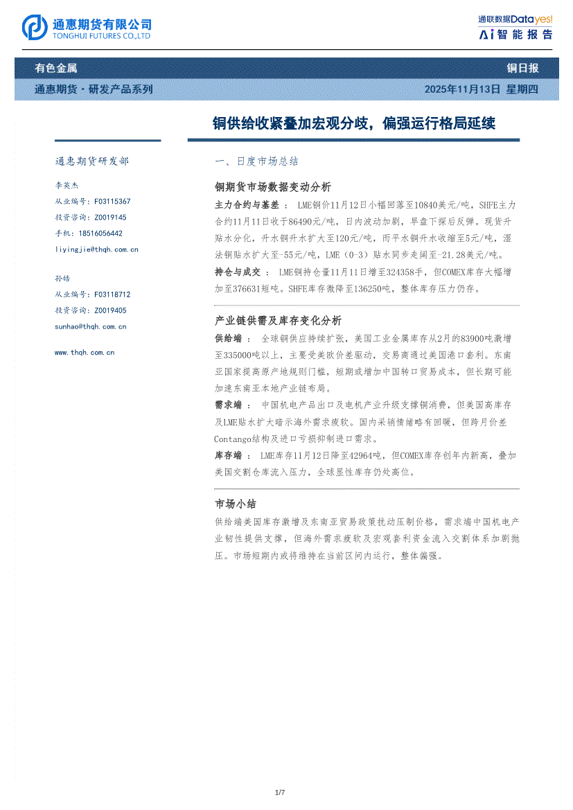 通惠期货-铜日报:铜供给收紧叠加宏观分歧,偏强运行格局延续-251113