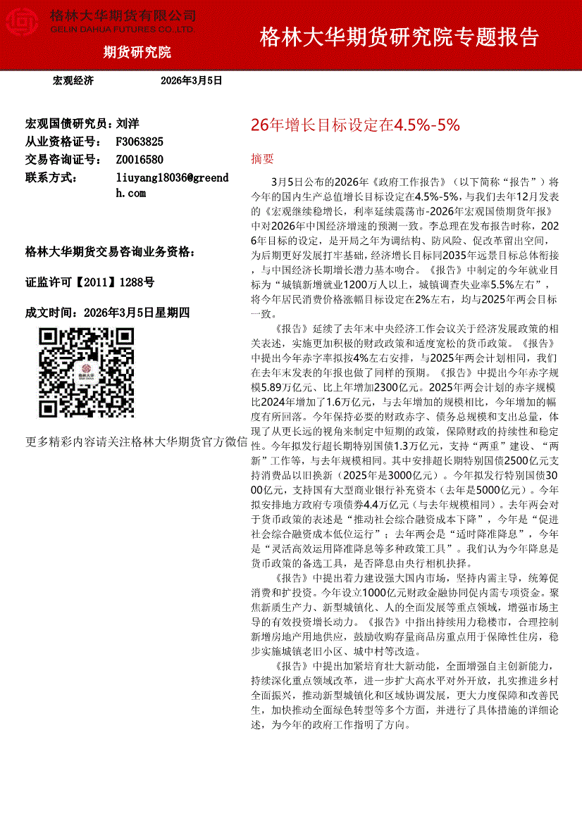 格林大华期货-宏观经济专题报告:26年增长目标设定在4.5%~5%-260305