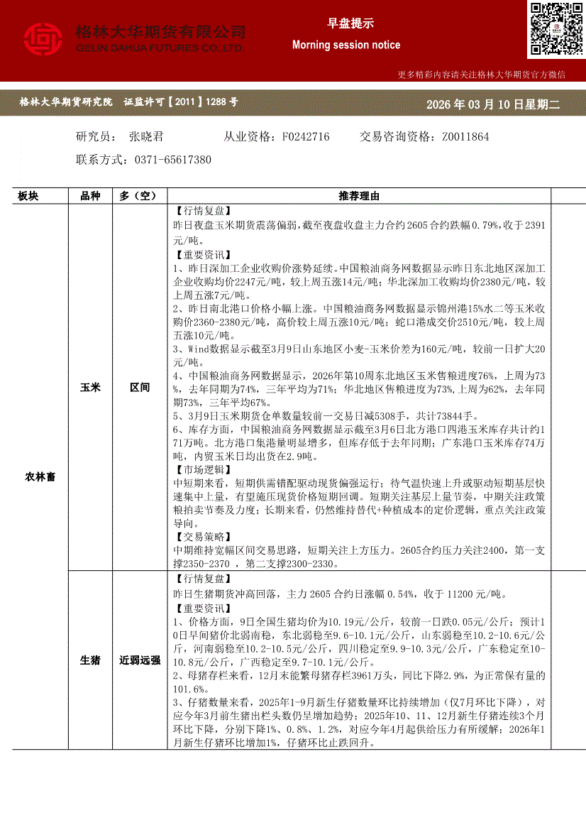 格林大华期货-早盘提示:玉米生猪鸡蛋-260311