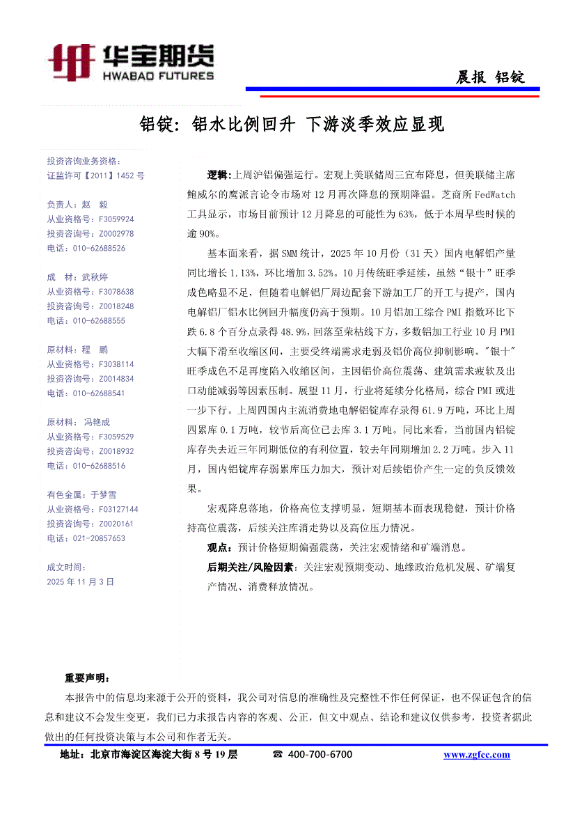 华宝期货-铝锭晨报:铝水比例回升,下游淡季效应显现-251103