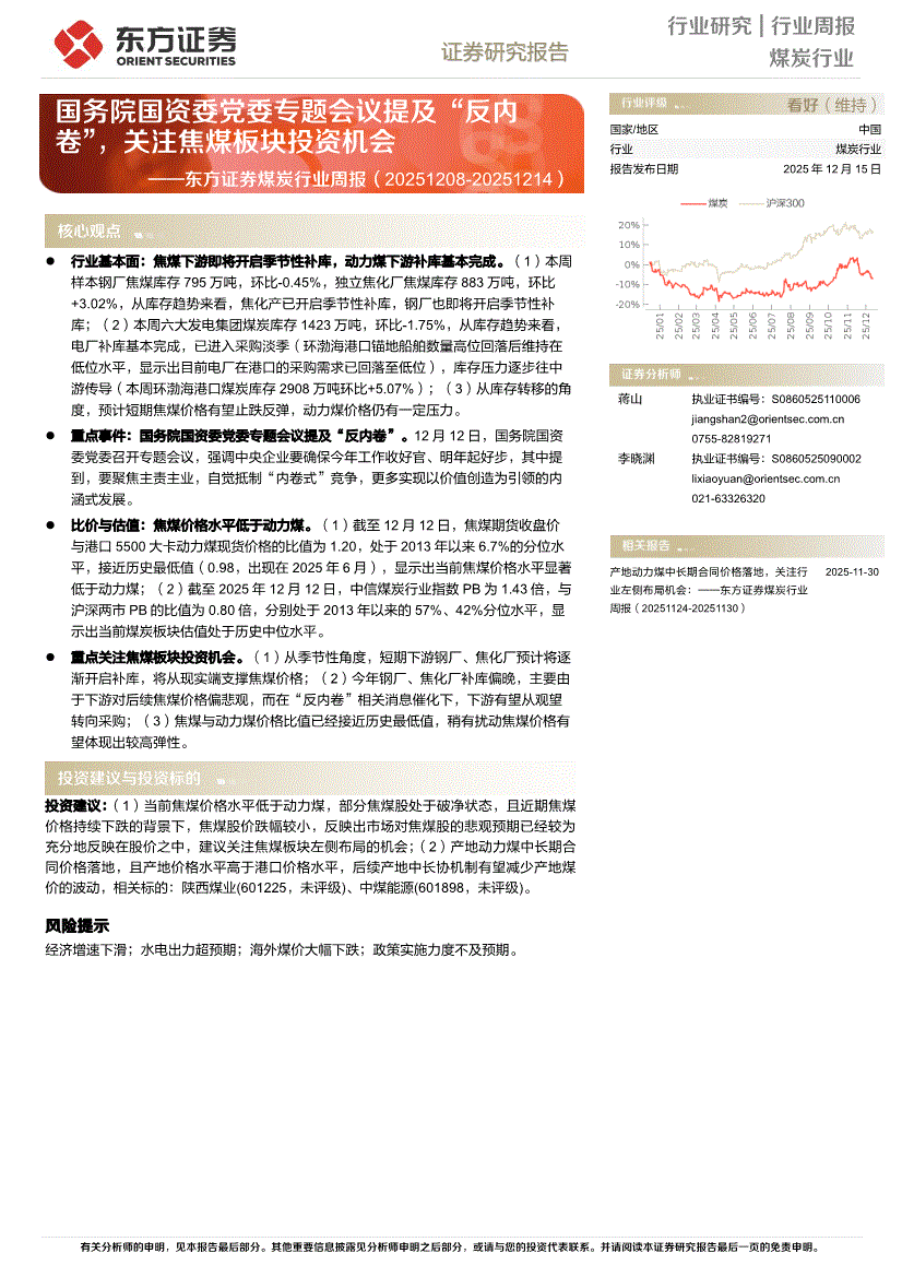 煤炭行业:东方证券-煤炭行业周报:国务院国资委党委专题会议提及“反内卷”,关注焦煤板块投资机会-251215