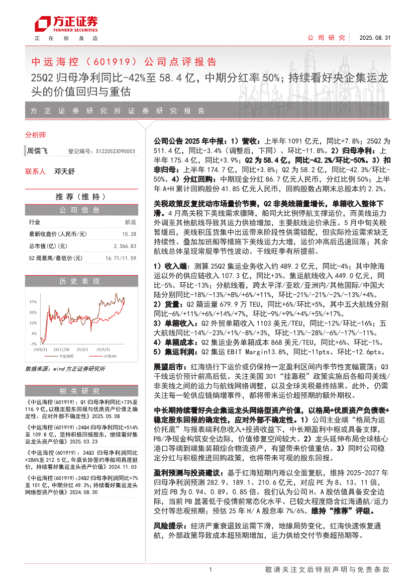 中远海控:方正证券-中远海控-601919-公司点评报告:25Q2归母净利同比负42%至58.4亿,中期分红率50%;持续看好央企集运龙头的价值回归与重估-250831