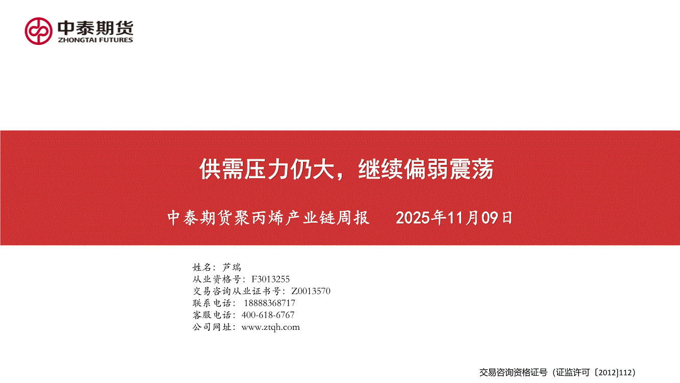 中泰期货-聚丙烯产业链周报:供需压力仍大,继续偏弱震荡-251109