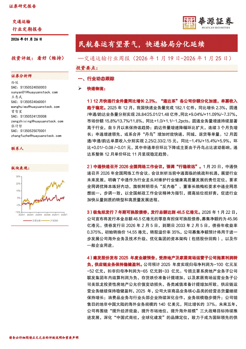 华源证券-交通运输行业周报(2026年1月19日~2026年1月25日):民航春运有望景气,快递格局分化延续-260126