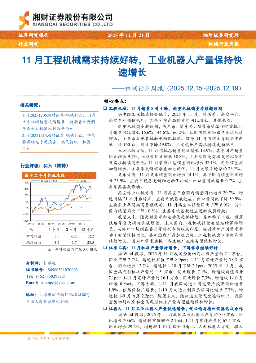 机械行业:湘财证券-机械行业周报:11月工程机械需求持续好转,工业机器人产量保持快速增长-251221
