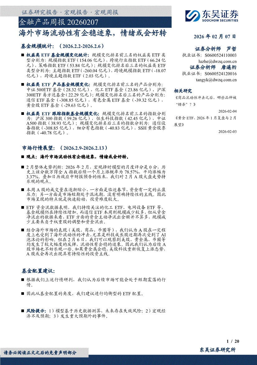 东吴证券-金融产品周报:海外市场流动性有企稳迹象,情绪或会好转-260207
