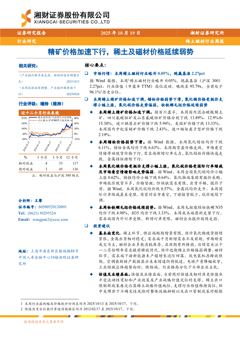 稀土磁材行业:湘财证券-稀土磁材行业周报:精矿价格加速下行,稀土及磁材价格延续弱势-251019