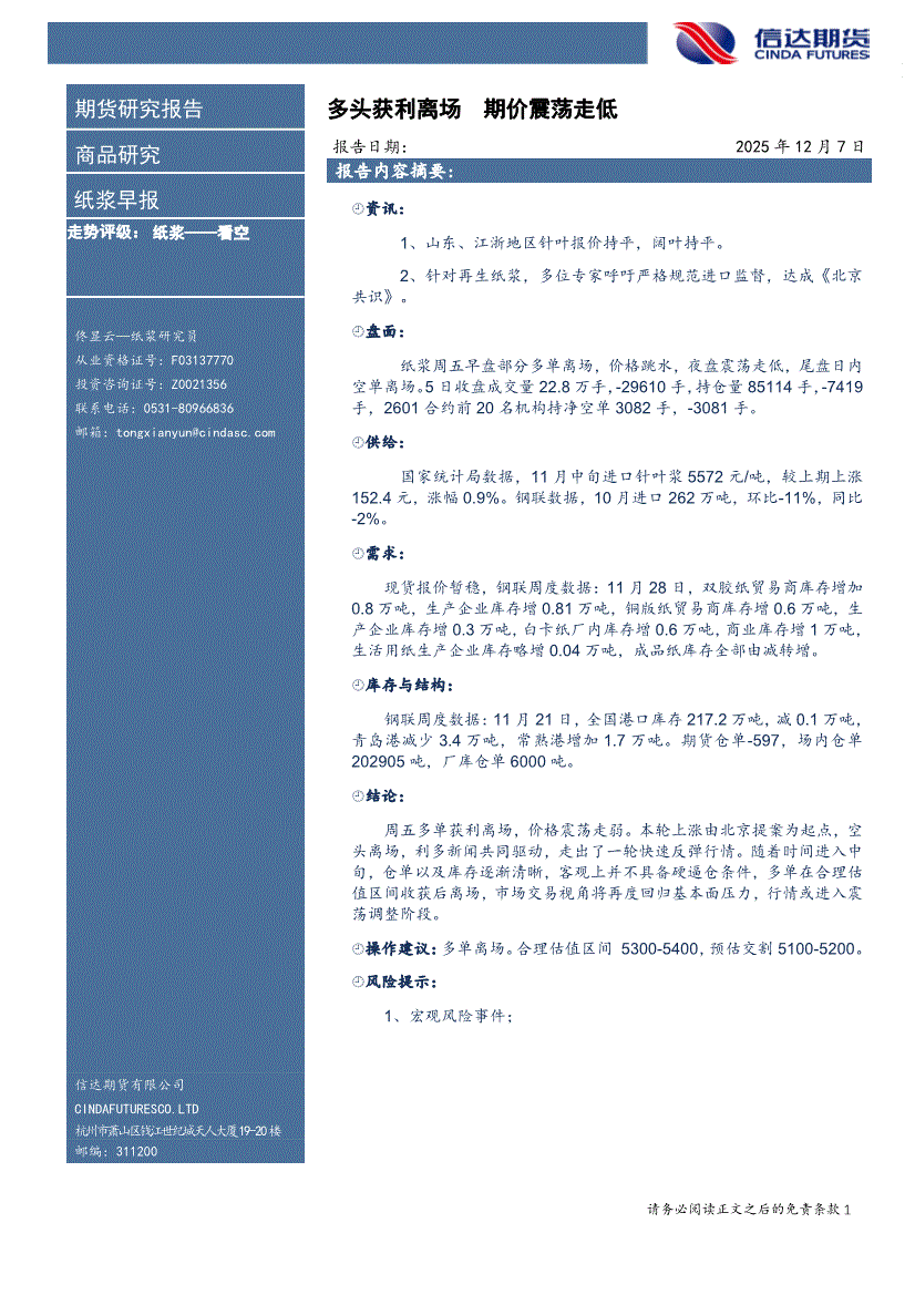 信达期货-纸浆早报:增仓下跌,空单持有-251209