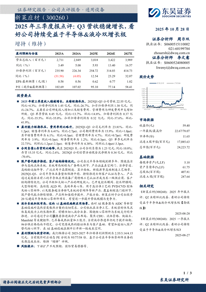 新莱应材:东吴证券-新莱应材-300260-2025年三季度报点评:Q3营收稳健增长,看好公司持续受益于半导体&液冷双增长极-251028