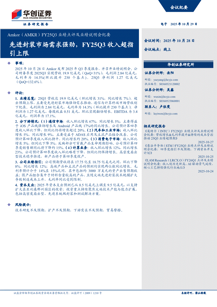 Amkor:华创证券-Amkor-AMKR.US-FY25Q3业绩点评及业绩说明会纪要:先进封装市场需求强劲,FY25Q3收入超指引上限-251029