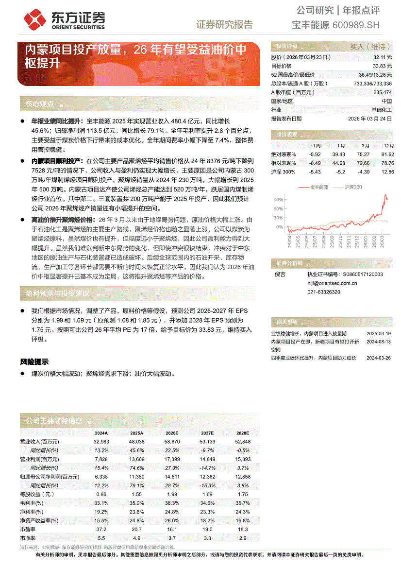 宝丰能源:东方证券-宝丰能源-600989-内蒙项目投产放量,26年有望受益油价中枢提升-260324