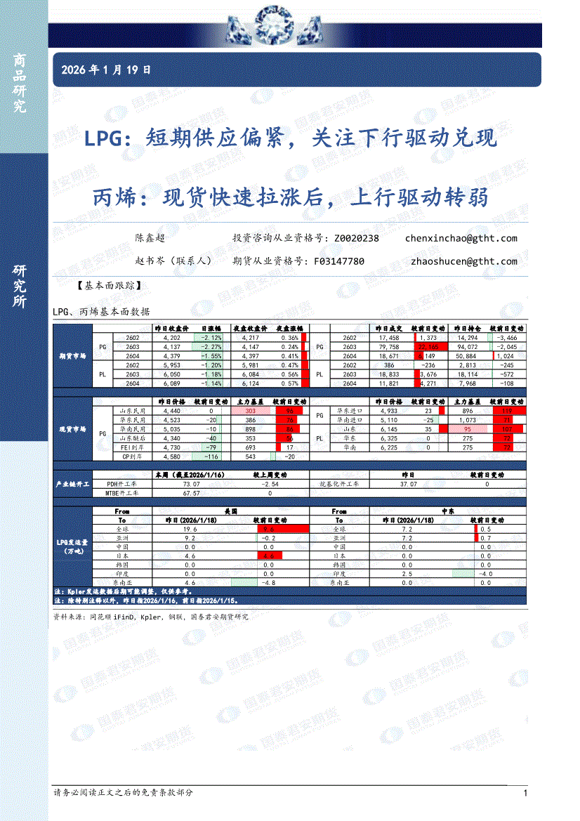 国泰君安期货-LPG:短期供应偏紧,关注下行驱动兑现,丙烯,现货快速拉涨后,上行驱动转弱-260119