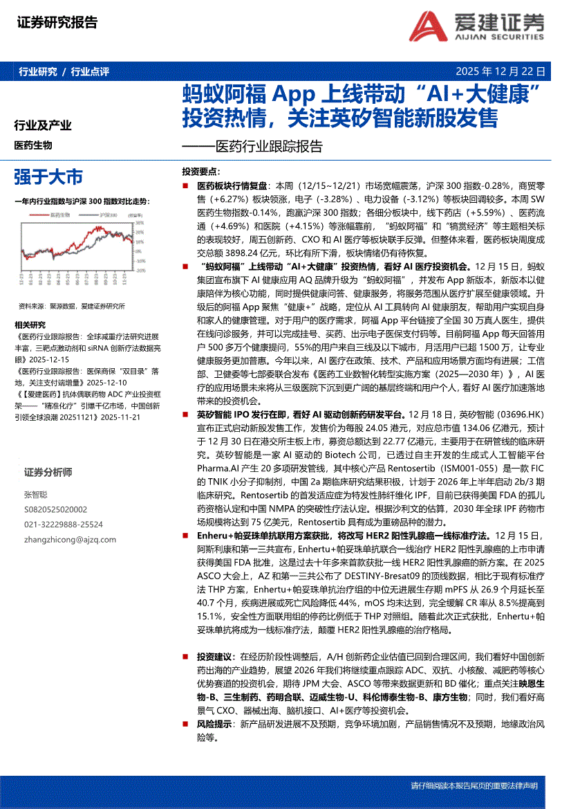 医药行业:爱建证券-医药行业跟踪报告:蚂蚁阿福App上线带动“AI+大健康”投资热情,关注英矽智能新股发售-251222