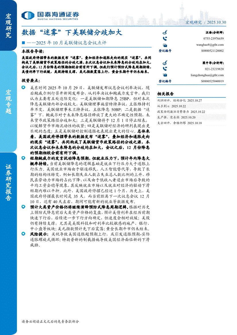 国泰海通证券-2025年10月美联储议息会议点评:数据“迷雾”下美联储分歧加大-251030