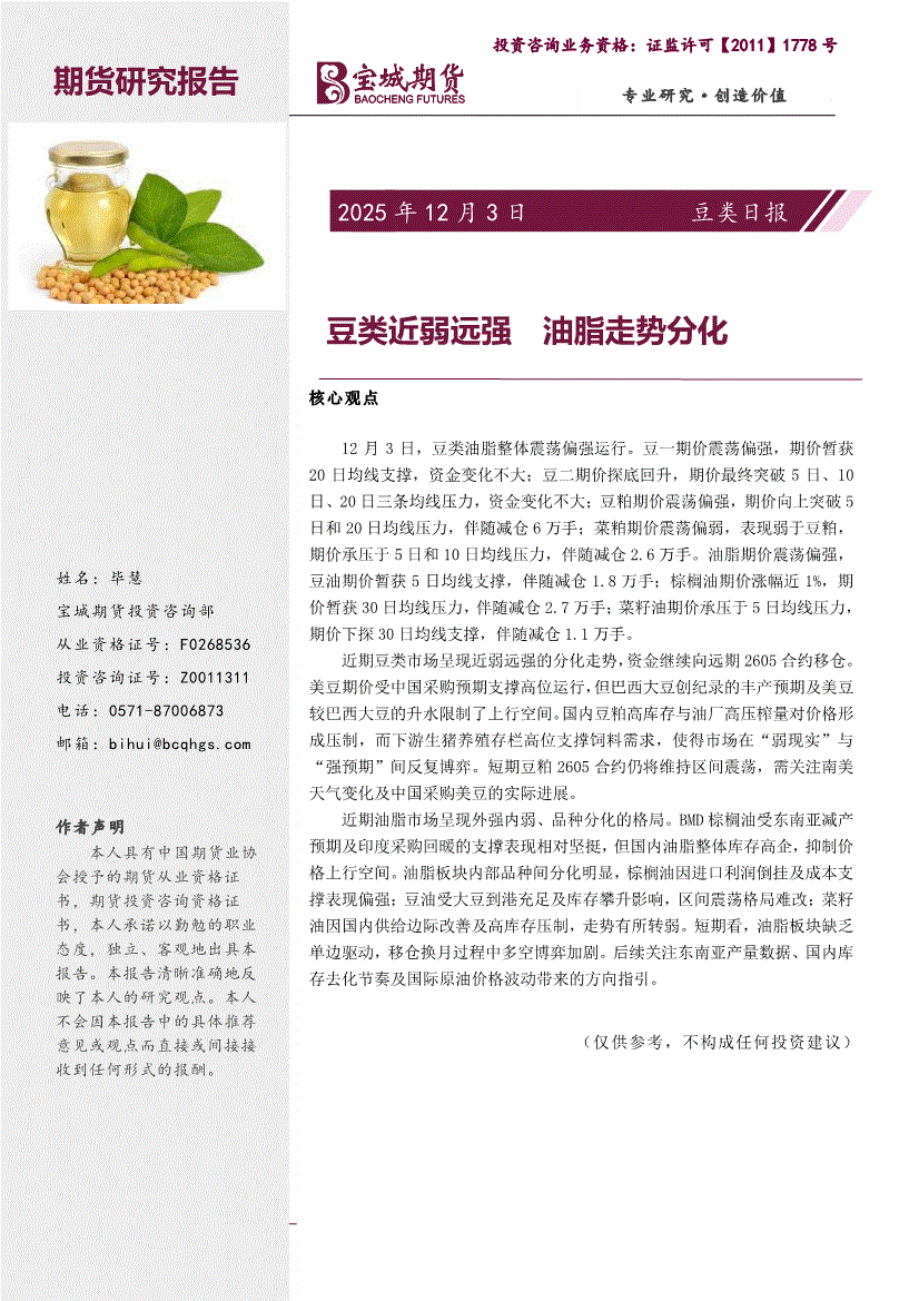宝城期货-豆类日报:豆类油脂分化延续,资金逐渐移仓远月-251202