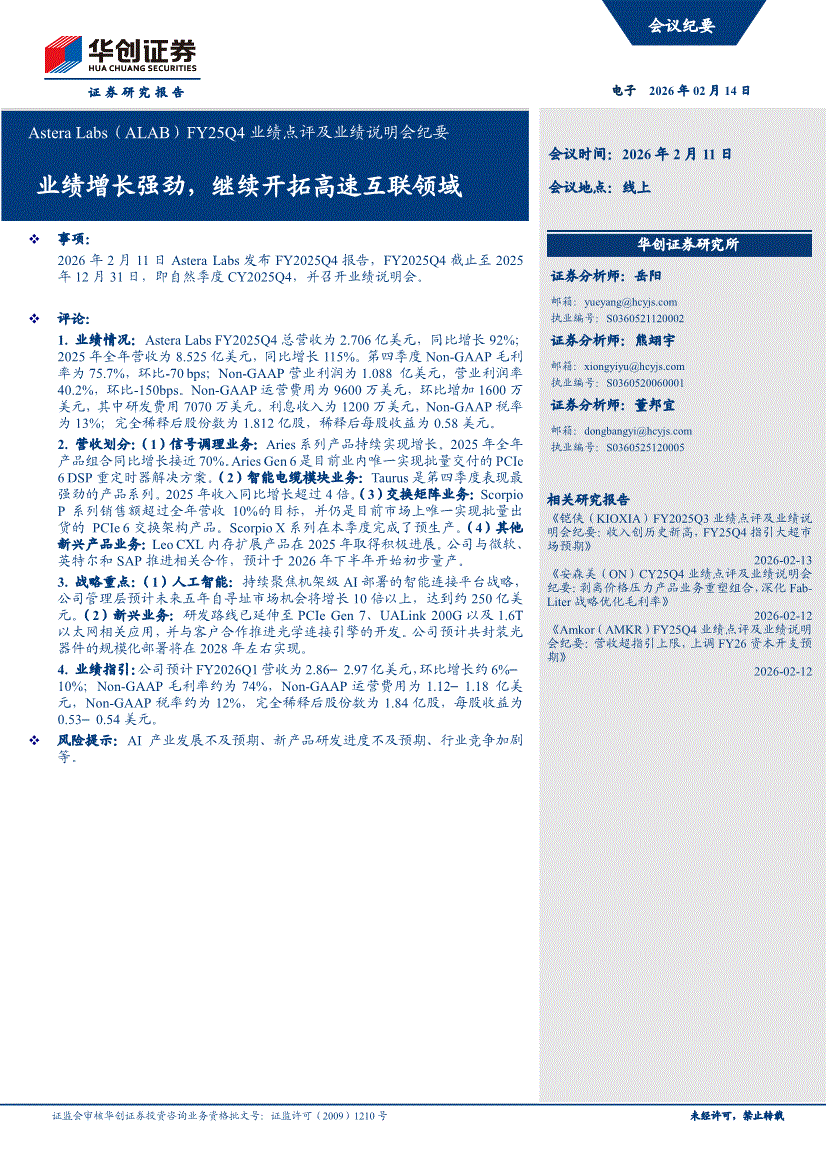 Astera Labs:华创证券-Astera Labs-ALAB.US-FY25Q4业绩点评及业绩说明会纪要:业绩增长强劲,继续开拓高速互联领域-260214