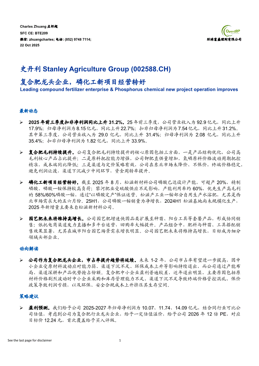 史丹利:环球富盛-史丹利-002588-复合肥龙头企业,磷化工新项目经营转好-251022