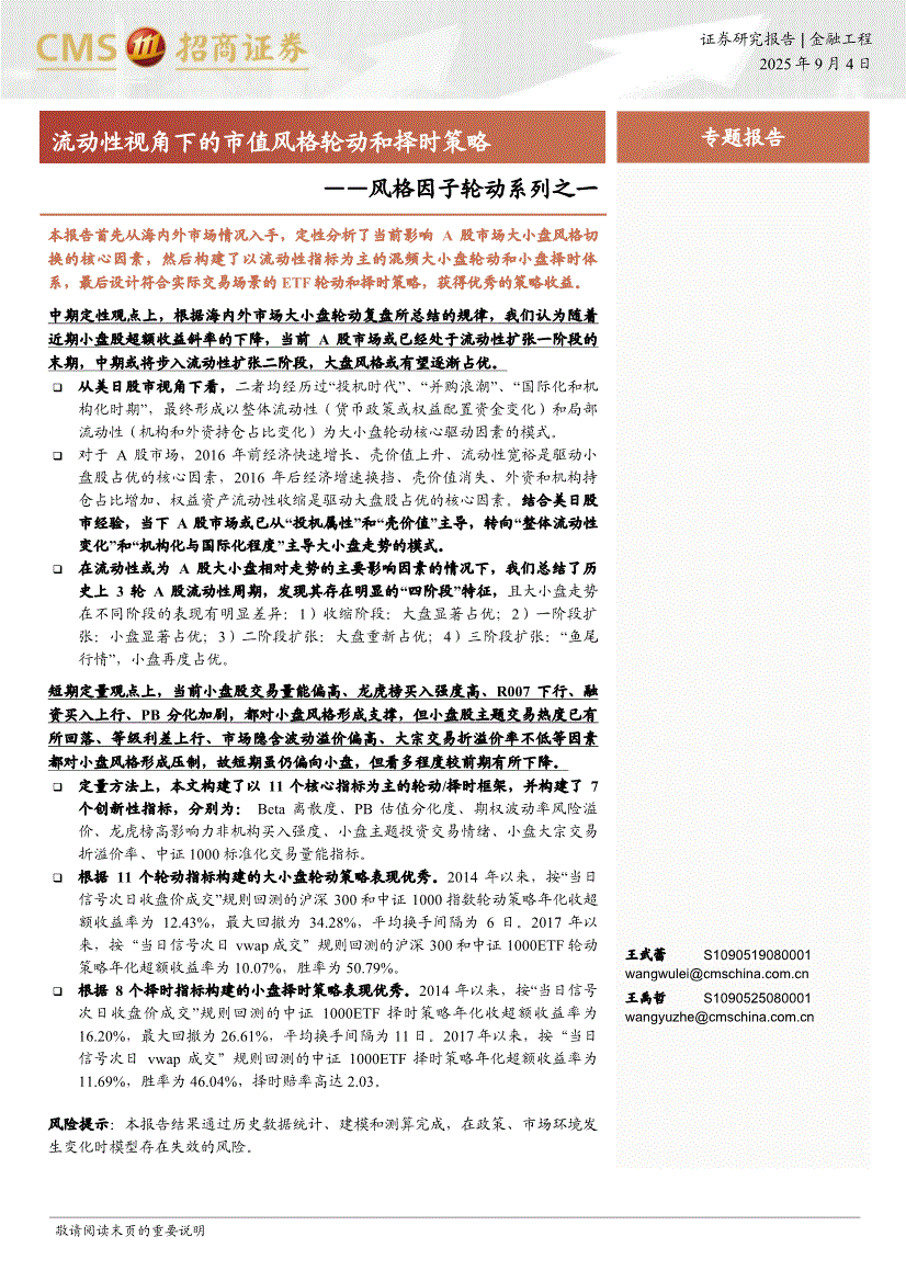 招商证券-风格因子轮动系列之一:流动性视角下的市值风格轮动和择时策略-250904