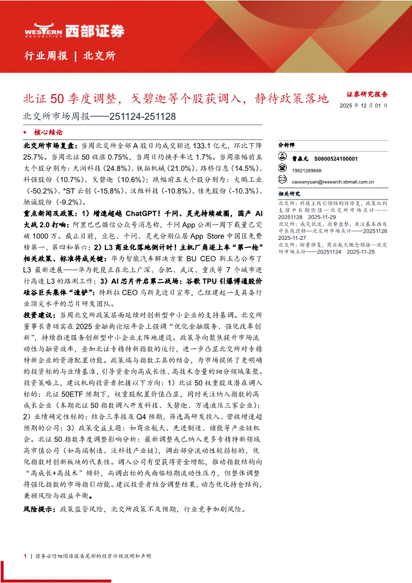 西部证券-北交所市场周报:北证50季度调整,戈碧迦等个股获调入,静待政策落地-251201