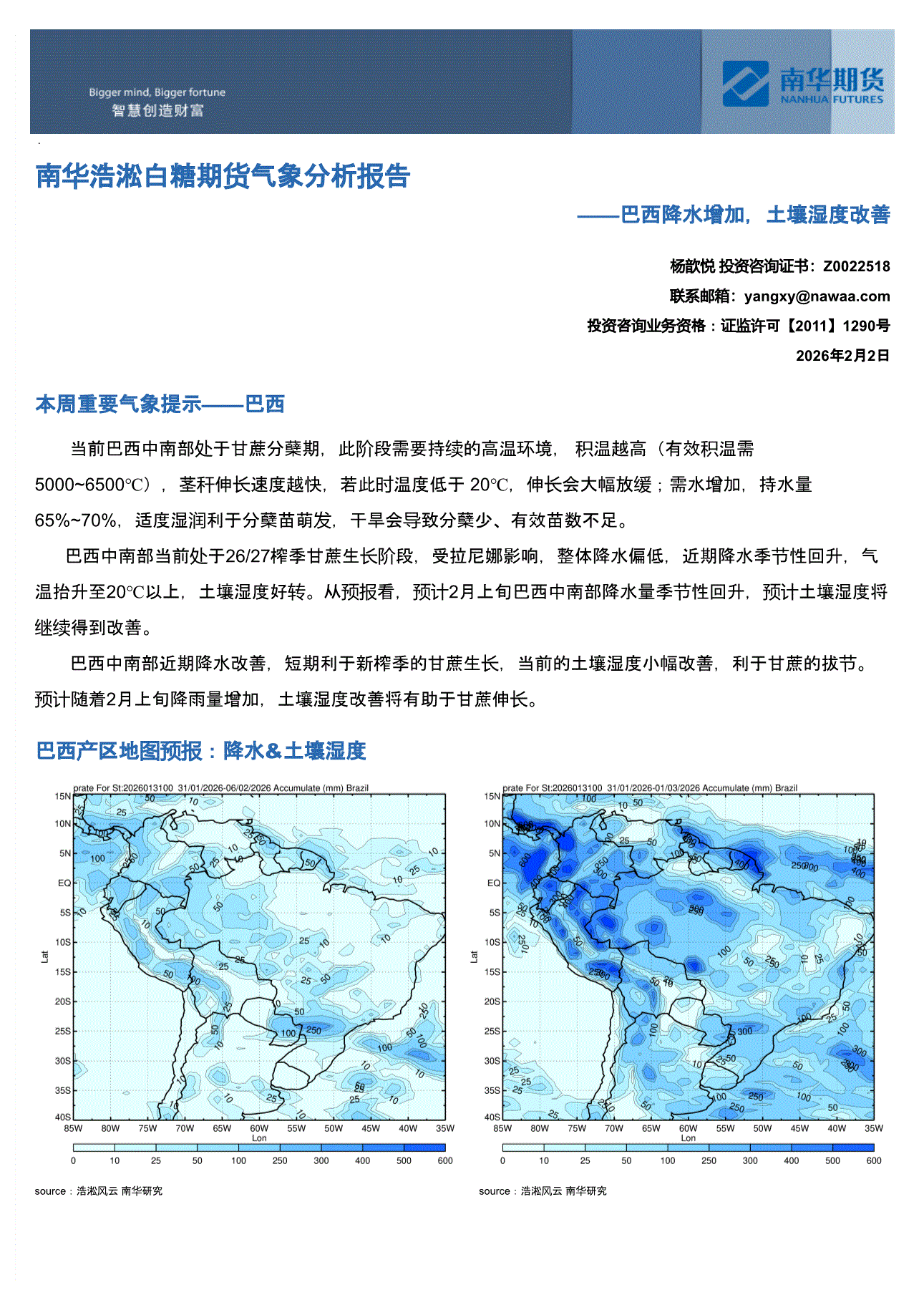 南华期货-浩淞白糖期货气象分析报告:巴西降水增加,土壤湿度改善-260202