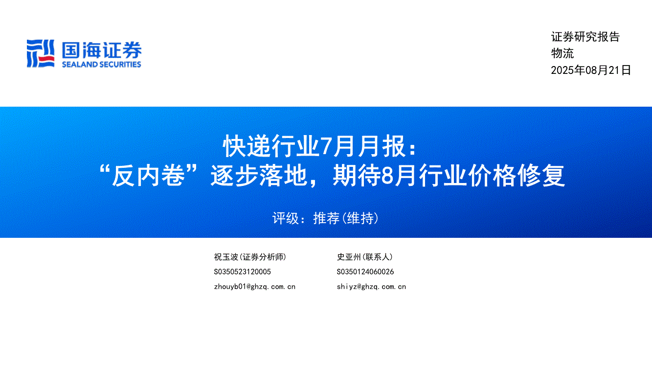 快递行业:国海证券-快递行业7月月报:“反内卷”逐步落地,期待8月行业价格修复-250821