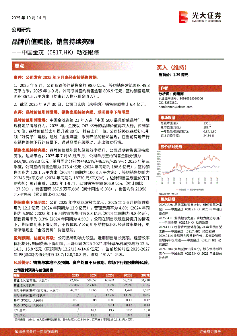 中国金茂:光大证券-中国金茂-0817.HK-动态跟踪报告:品牌价值赋能,销售持续亮眼-251014