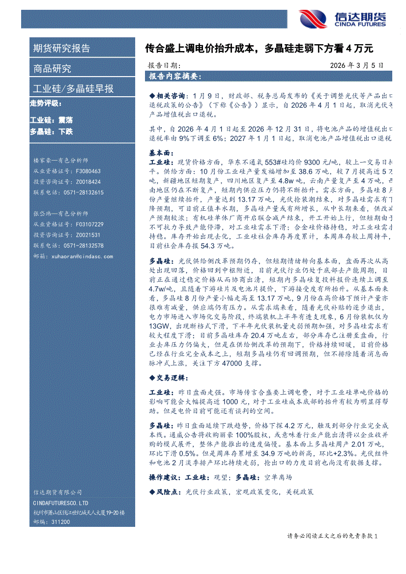 信达期货-工业硅/多晶硅早报:传合盛上调电价抬升成本,多晶硅走弱下方看4万元-260305