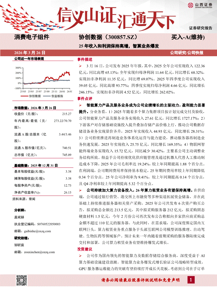 协创数据:山西证券-协创数据-300857-25年收入和利润保持高增,智算业务爆发-260326