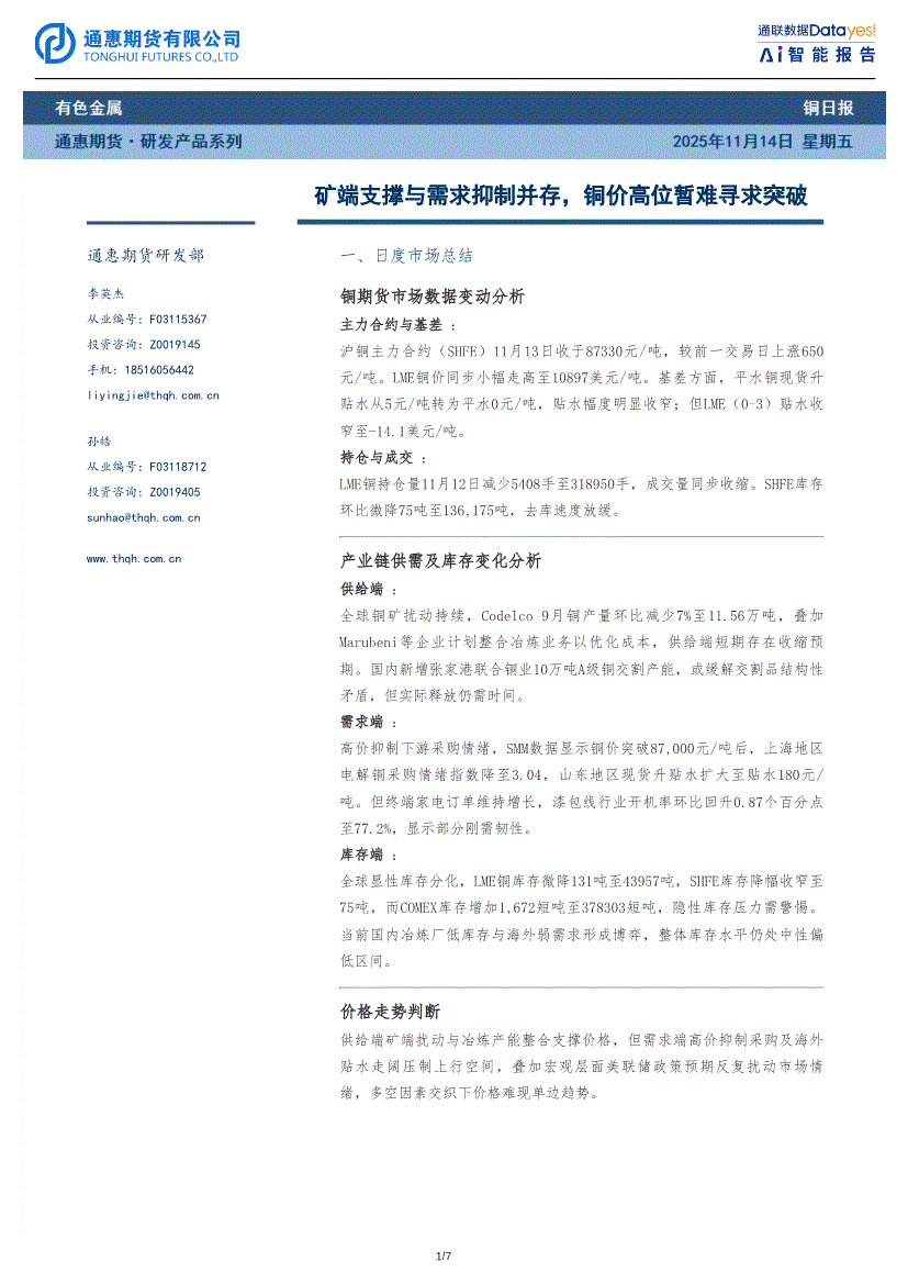 通惠期货-铜日报:矿端支撑与需求抑制并存,铜价高位暂难寻求突破-251114