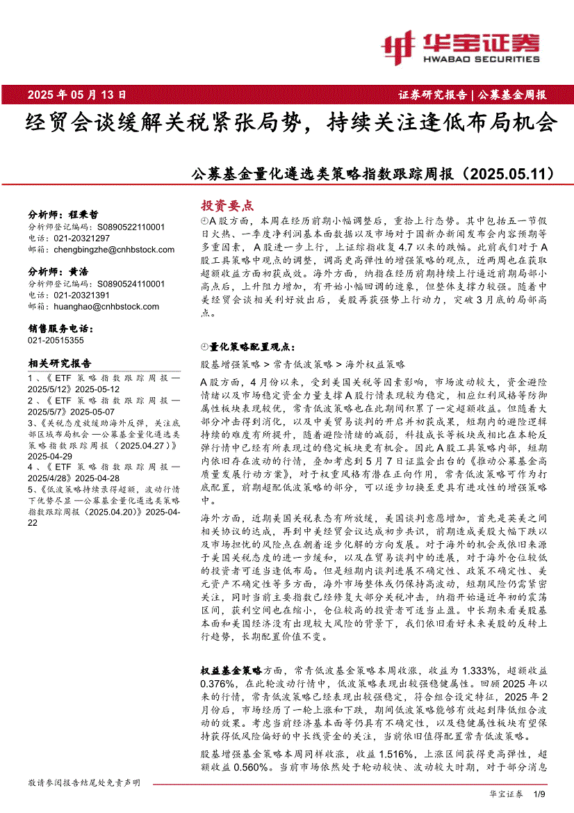 华宝证券-公募基金量化遴选类策略指数跟踪周报:经贸会谈缓解关税紧张局势,持续关注逢低布局机会-250513