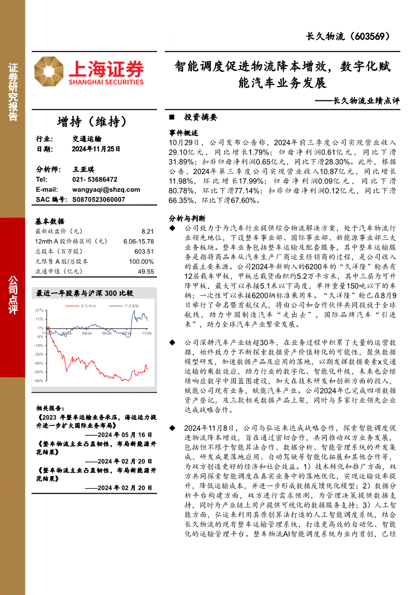 长久物流:上海证券-长久物流-603569-业绩点评:智能调度促进物流降本增效,数字化赋能汽车业务发展-241125