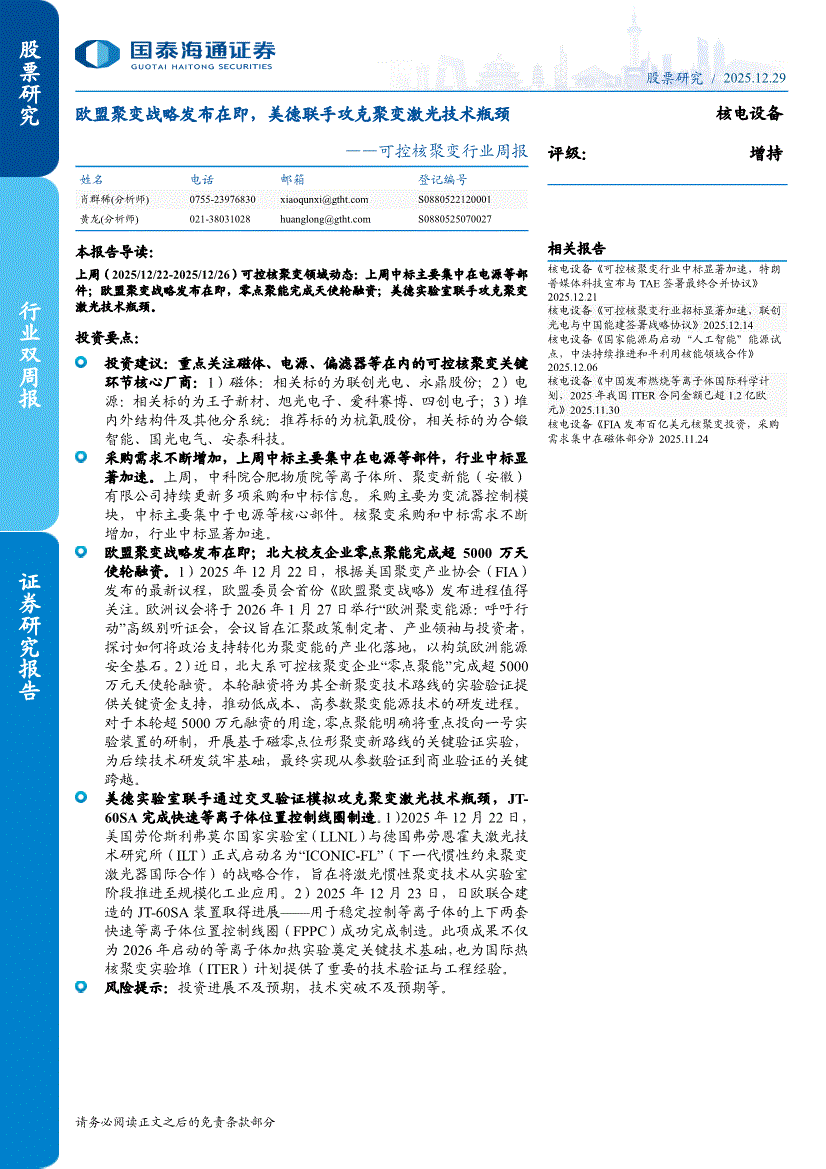 可控核聚变行业:国泰海通证券-可控核聚变行业周报:欧盟聚变战略发布在即,美德联手攻克聚变激光技术瓶颈-251229