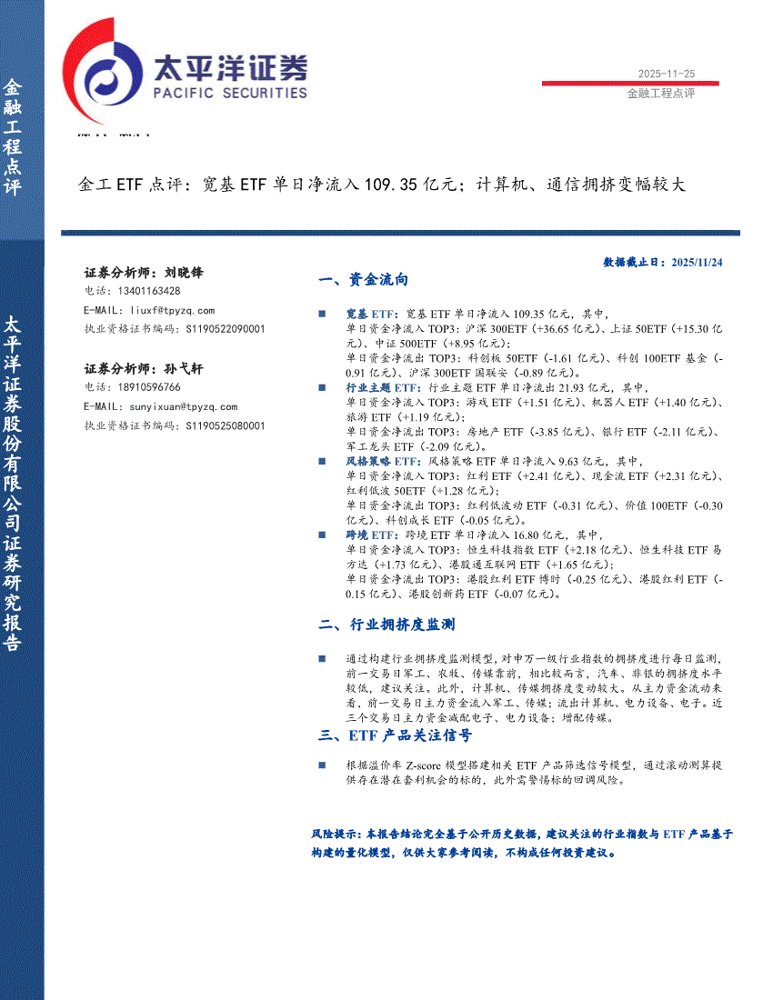 太平洋证券-金工ETF点评:宽基ETF单日净流入109.35亿元;计算机、通信拥挤变幅较大-251125