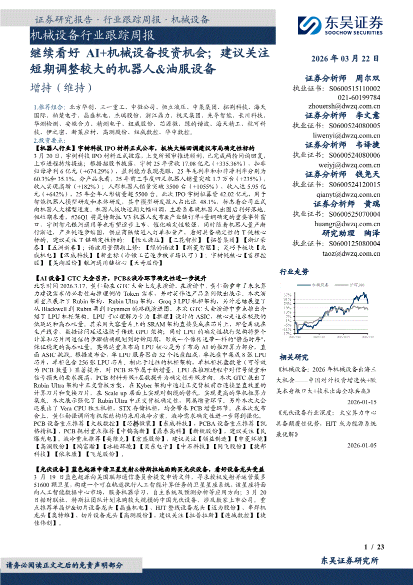 机械设备行业:东吴证券-机械设备行业跟踪周报:继续看好AI+机械设备投资机会;建议关注短期调整较大的机器人&油服设备-260322