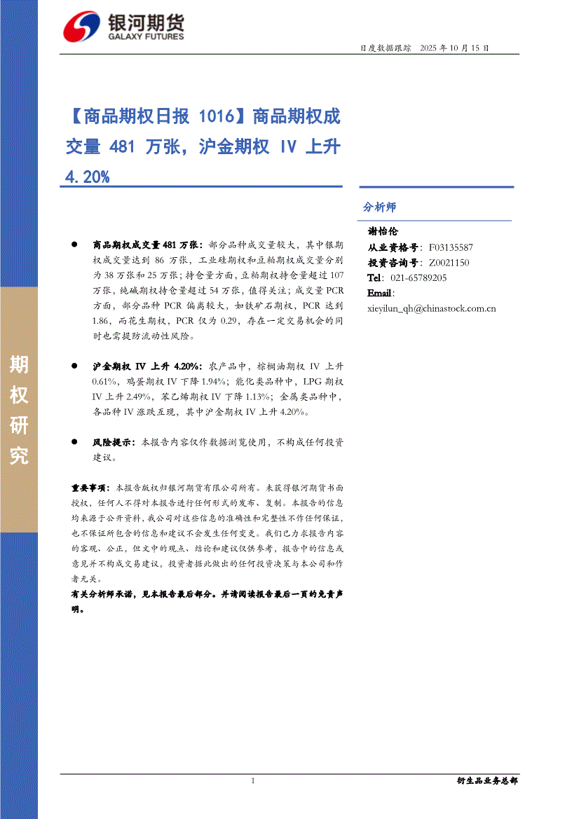银河期货-【商品期权日报1016】商品期权成交量481万张,沪金期权IV上升4.20%-251015
