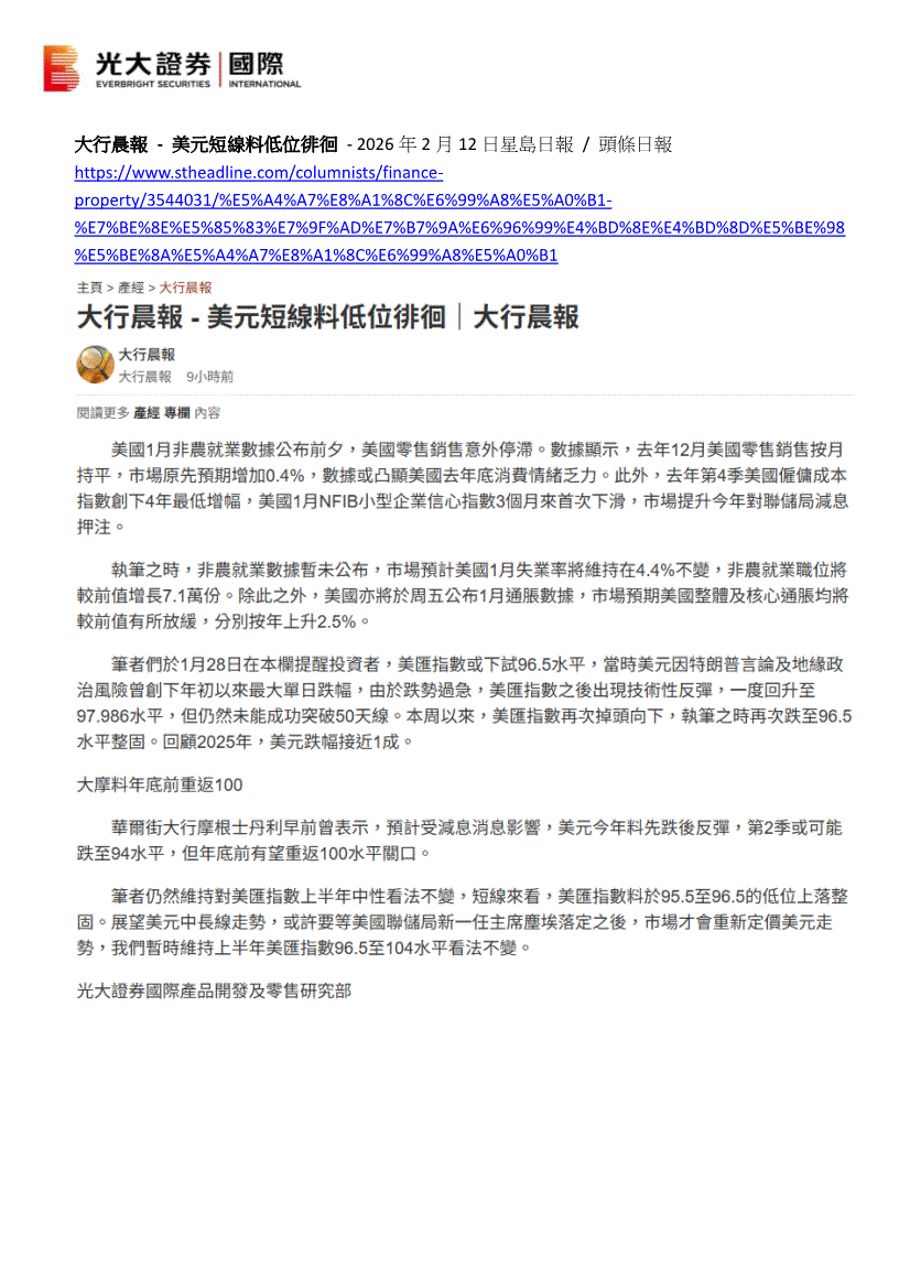 光大证券(国际)-大行晨报:美元短线料低位徘徊-260212