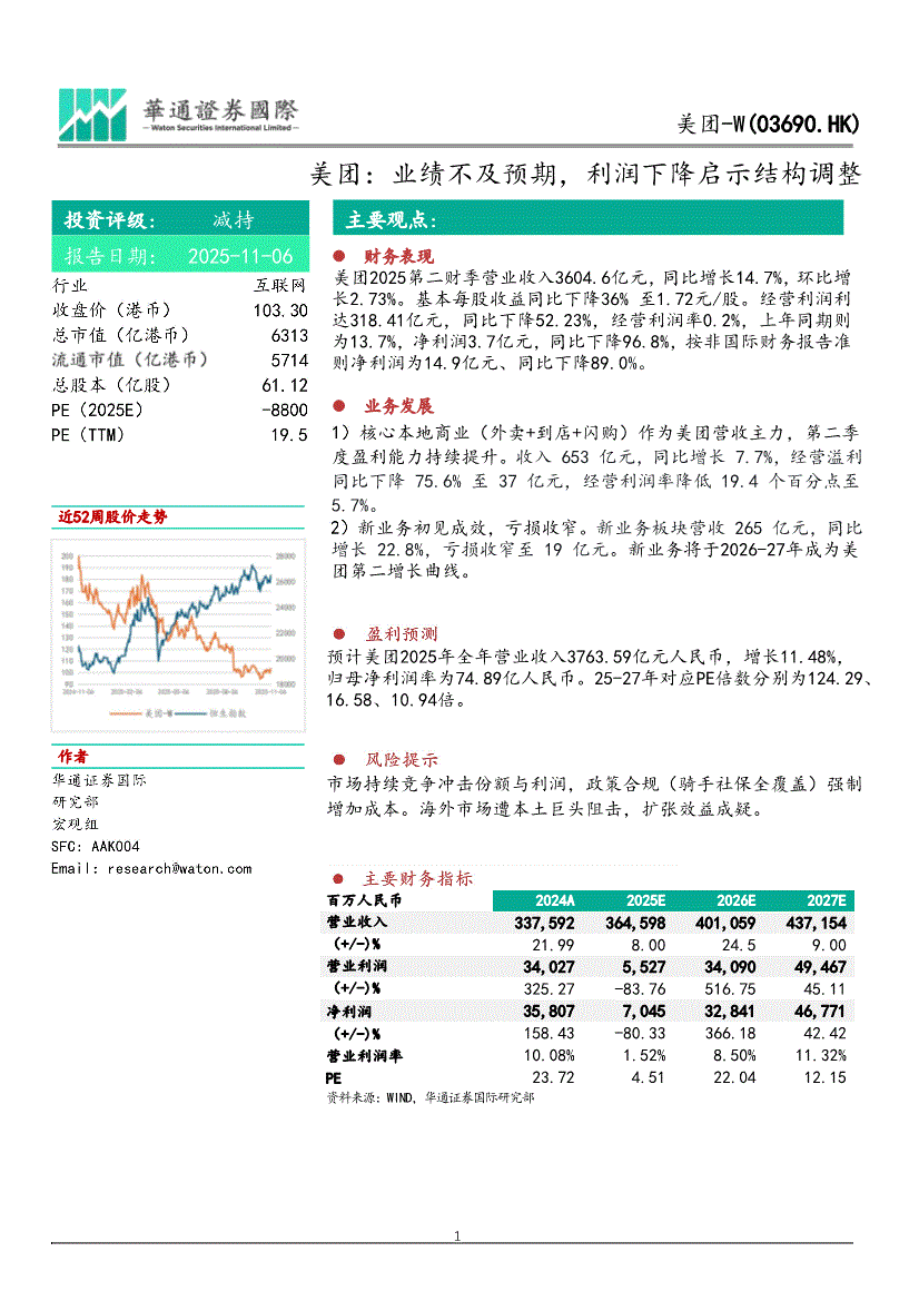 美团~W:华通证券国际-美团~W-3690.HK-业绩不及预期,利润下降启示结构调整-251106