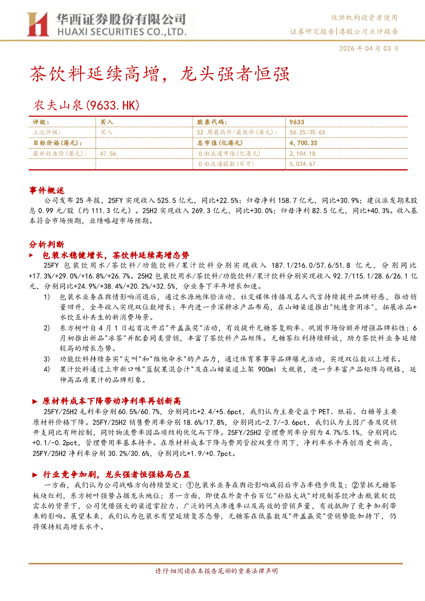 农夫山泉:华西证券-农夫山泉-9633.HK-茶饮料延续高增,龙头强者恒强-260403